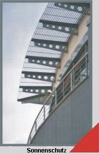 Sonnenschutzanlage bestehend aus Schwertern, Zierbohrungen und aufgelegter Lamellenkonstruktion. |