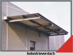 Abgespanntes Industrievordach bestehend aus U und I Trägern als Unterkonstruktion mit aufgelegtem Fassadenblech und Regenentwässerung am Gelände. |