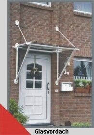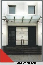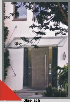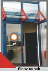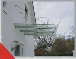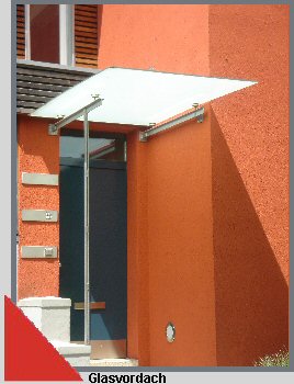 Einfache kleine Vordachkonstruktion bestehend aus zwei Glasscheiben, aufliegend und verklemmt, auf dreifarbig beschichteten Dreiecken aus ST 37-2. |