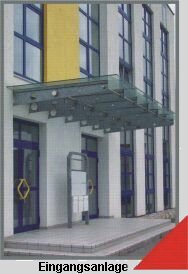 Glasvordachkonstruktion aus leichtem Edelstahlvierkantrohr mit aufliegender |