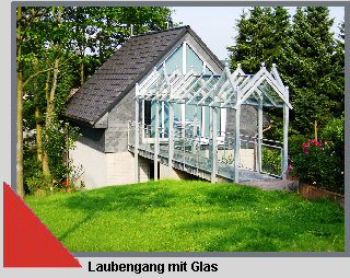 Laubengang aus verzinktem Stahl inkl. Brückenkonstruktion mit Glas verkleidet und Zierelementen. |
