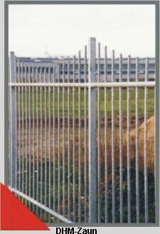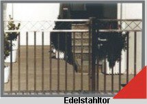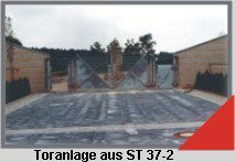 Toranlage aus ST 37-2 in verzinkter Ausführung mit schwerer Pfosten- und Riegelkonstruktion, incl. eingebauten Zierblechen. |