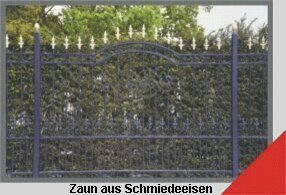 Schmiedeeiserne Zaunanlage mit vielen Zierelementen feuerverzinkt und anschließend zweifarbig lackiert. |