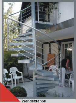 Wendeltreppe mit verzinkten Gitterroststufen. Treppengeländer aus Edelstahl. |