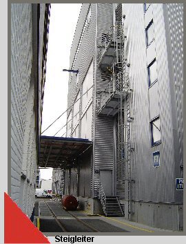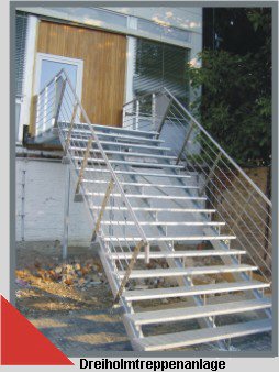 Dreiholmtreppenanlage mit Podest und Gitterroststufen als Fluchttreppe. Geländer aus Edelstahl mit Lochblechfüllungen im Bereich zwischen Treppe und Podest. |
