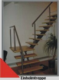 Einholmtreppe aus Edelstahl mit aufgeschraubten Treppenstufen aus Ahorn mit Podest und Geländer. |