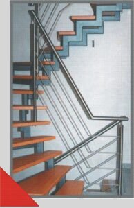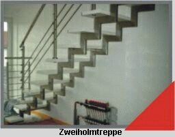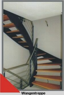 Treppenanlage aus 2 lackierten Flachwangen mit dazwischen liegenden Holzstufen. |