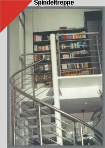Wendeltreppe bestehend aus einer Spindel, Durchmesser 100 mm mit gekanteten Blechstufen, gestrichen und mit Teppichboden beklebt. Hochwertiges Edelstahlgeländer, bestehend aus 42 mm Rundrohr in einem Stück gebogen und dazugehörigem Brüstungsgeländer. |
