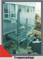 Fertigung und Montage einer Treppenanlage mit Gitterrostbelag, Geländer als Industriegeländer, jedoch mit Handlauf aus Edelstahl. |