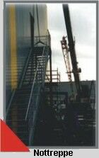 Zweigeschossige Nottreppe inkl. Geländer aus IPE-Trägern und Gitterroststufen in verzinkter Ausführung, in einem Teil montiert. |